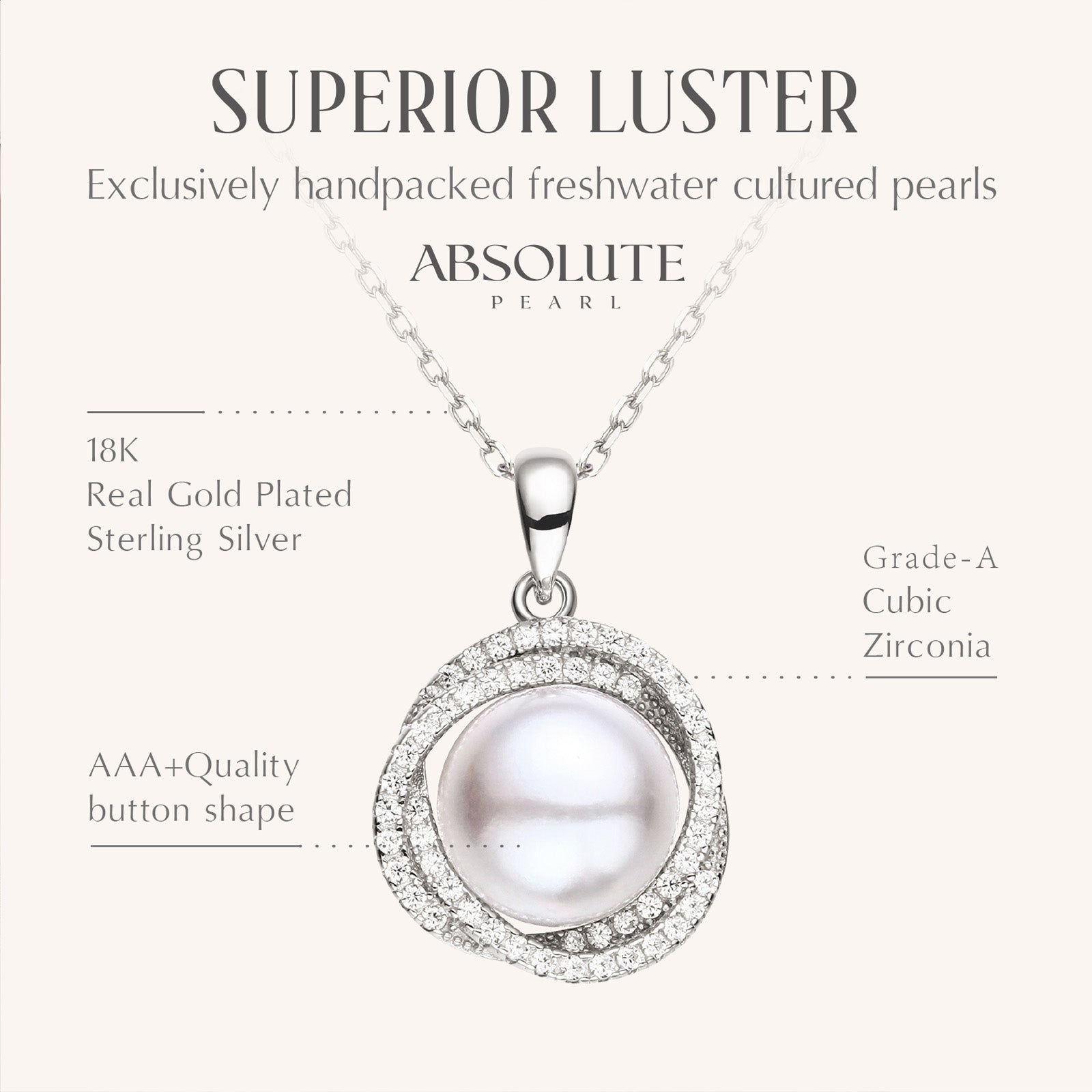 TOP QUALITY JEWELRY: Handpicked, real pearl with thick and iridescent nacre. The pearl is mounted on the finest quality .925 Sterling Silver with dazzling Cubic Zirconia gemstones and suspended on a matching 17 inch chain.