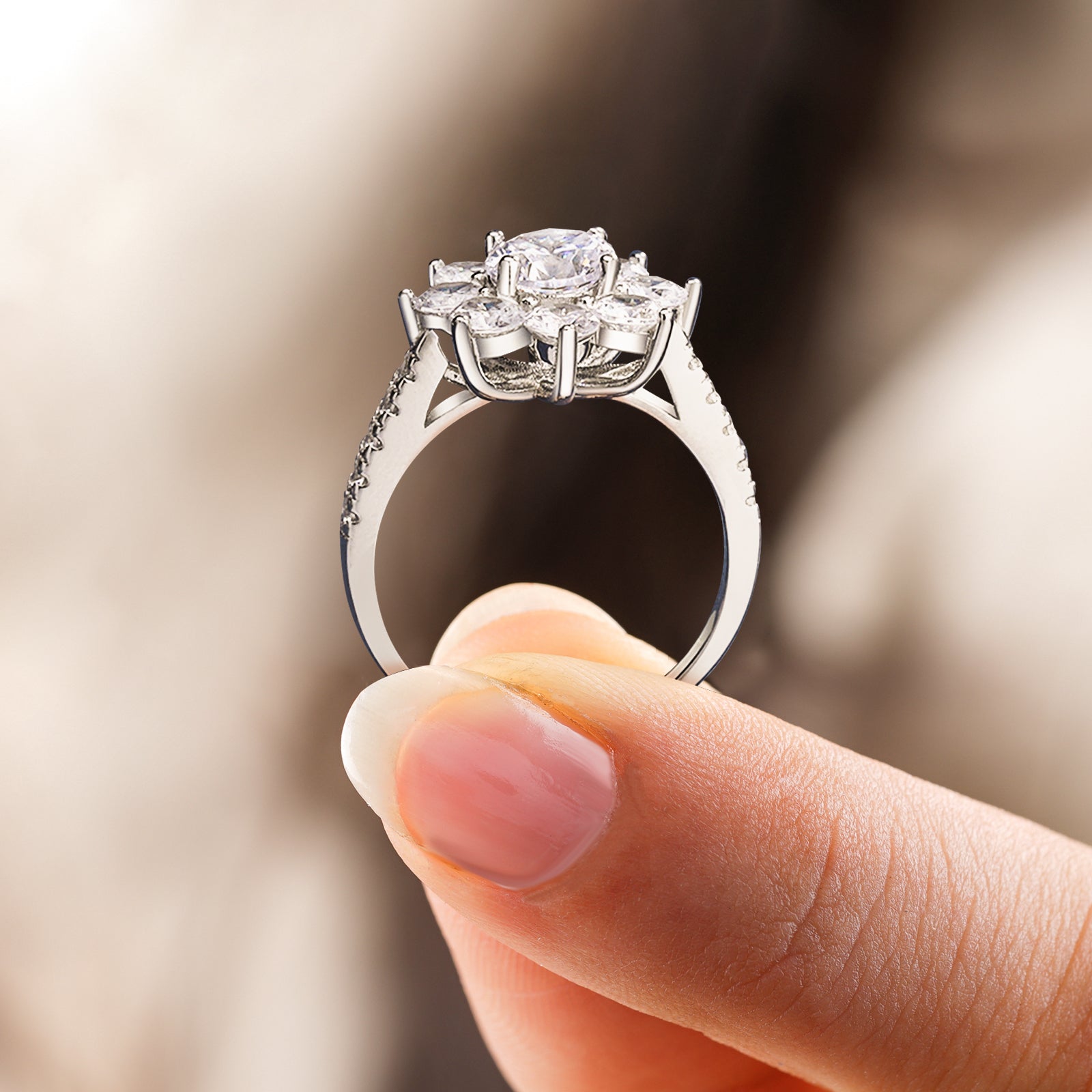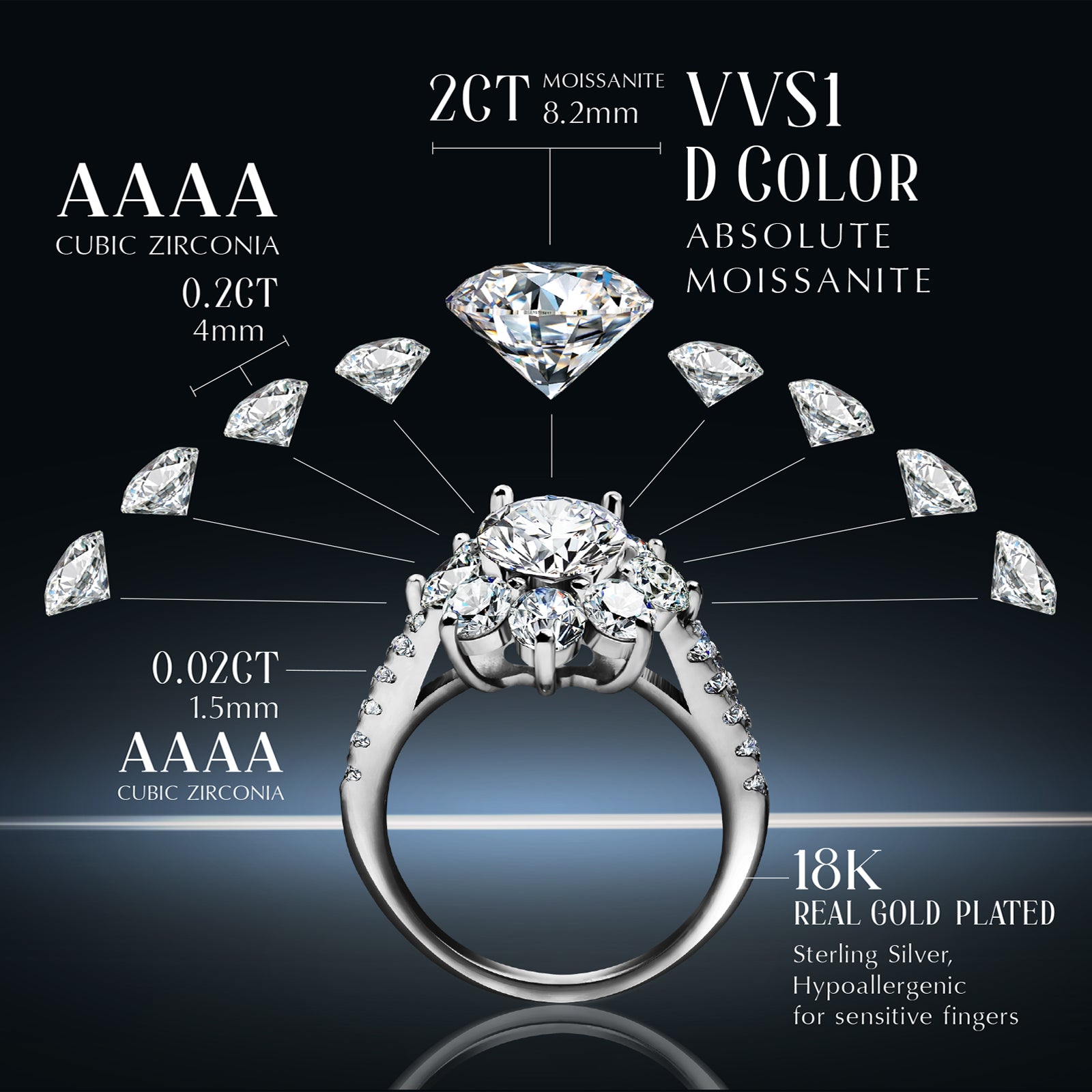 【MOISSANITE RINGS】The moissanite engagement ring is made of 100% 2 Carat center solitaire Moissanite +CZ accent stones.Moissanite share the similar color, hardness and element with diamond, and 2.5 times brilliance than diamonds.