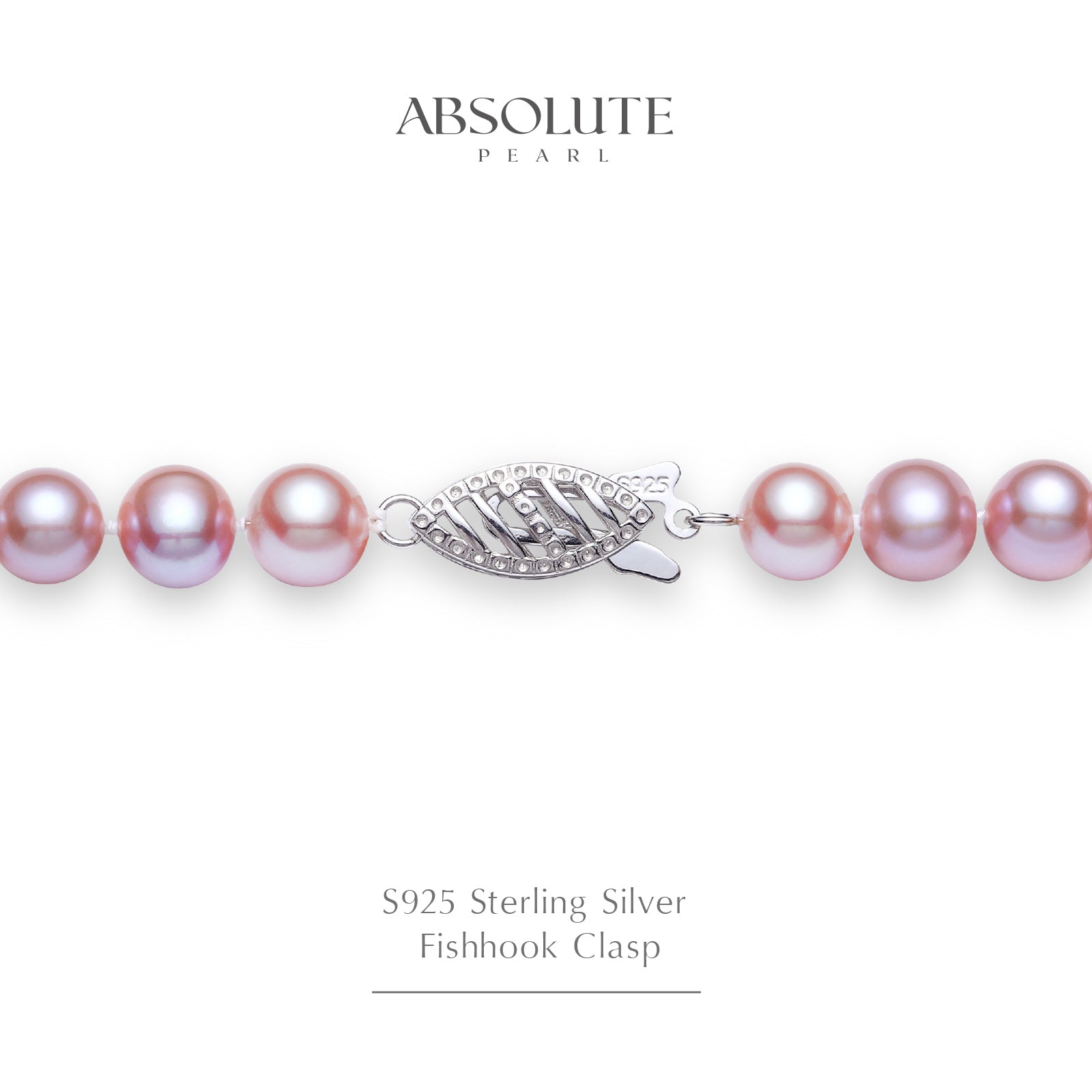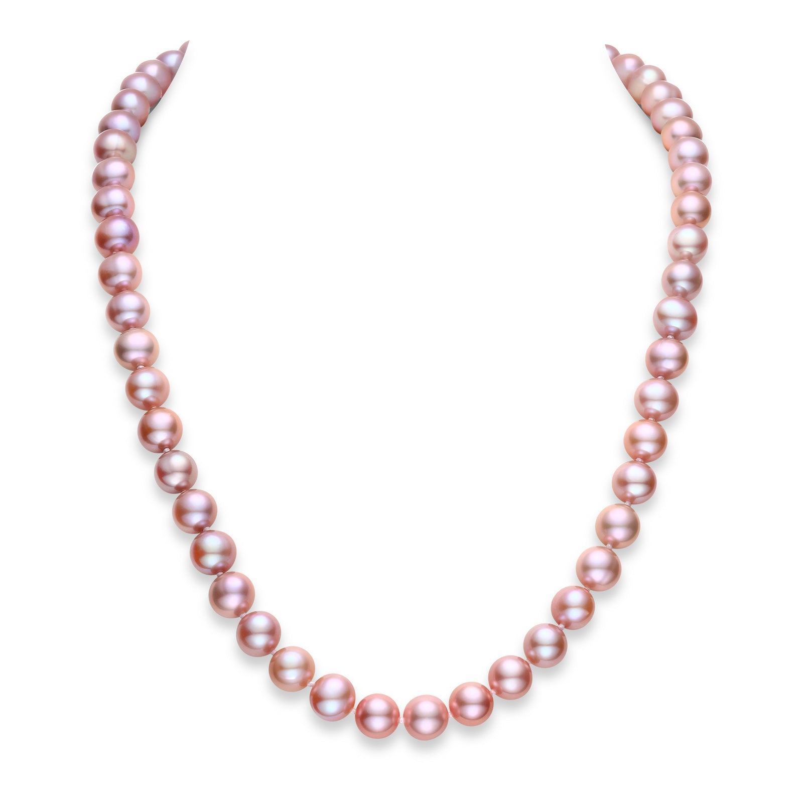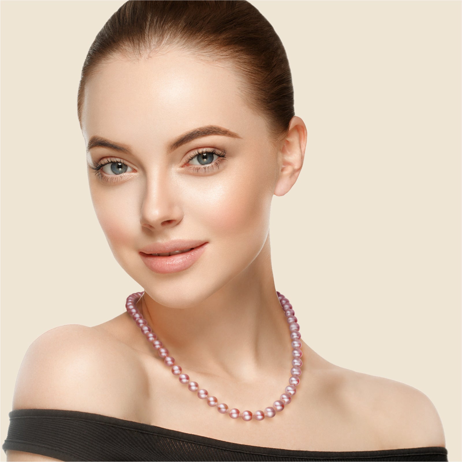 This 7.5-8.5mm pink freshwater pearl necklace is certain to be a favorite for any occasion. This pearl necklace is compiled of beautiful hand picked pearls with an 'high' grade luster. The pearl necklace is brilliant lavender color and comes affixed with a beautiful 18K gold plated sterling silver clasp.